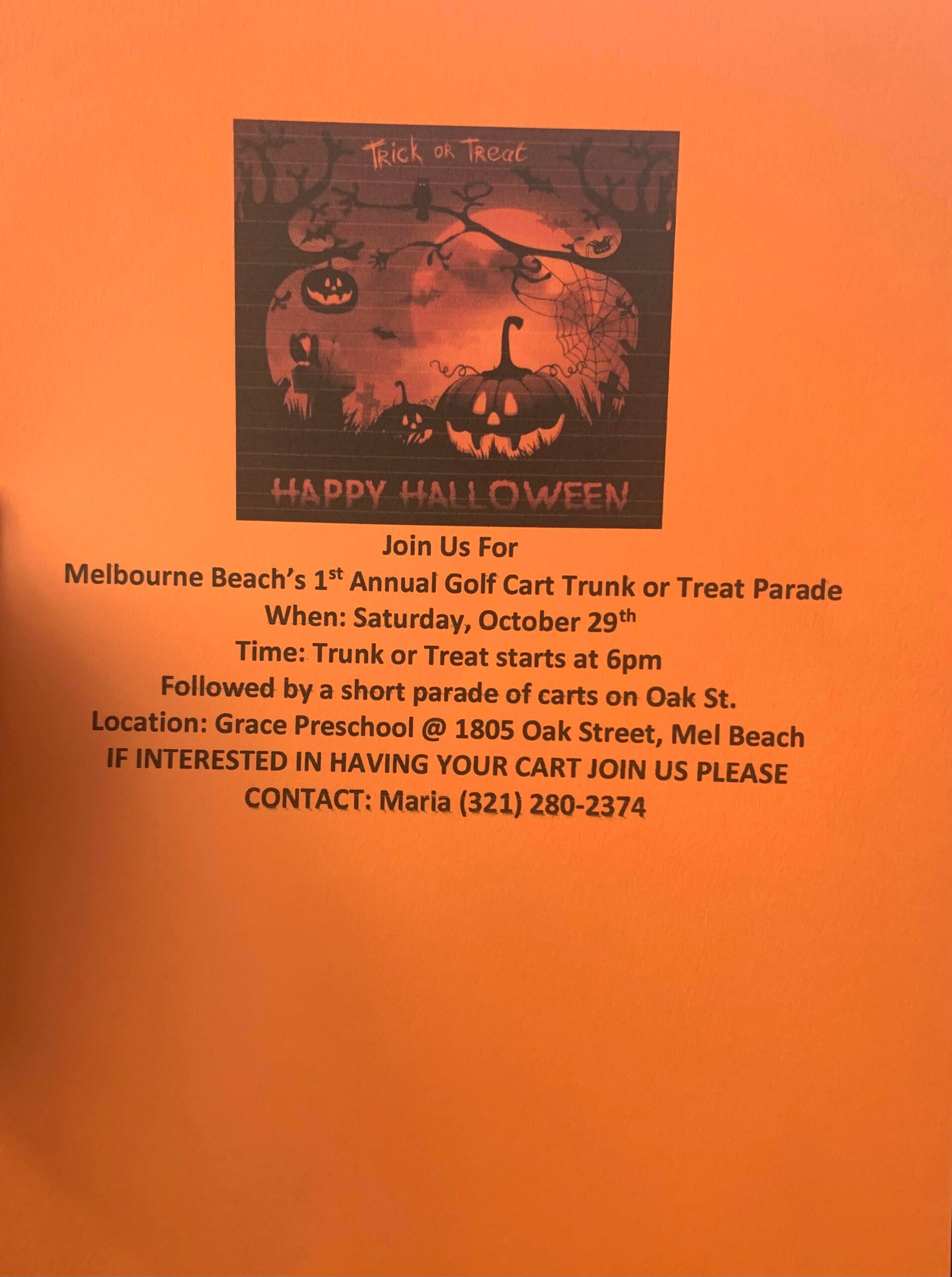FreeCalling all Melbourne Beach Golf Carts….Decorate your golf cart and bring along some candy. We are having Melbourne Beach’s first ever Golf Cart trunk or treat and parade.